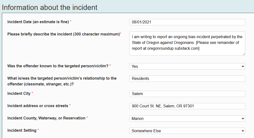I am writing to report a bias incident perpetrated by the State of Oregon against Oregonians. I understand your division is getting an extra $2 million from the Governor to ensure Oregon can respond, urgently, to hate crimes and bias incidents now that Donald Trump is president again. I trust those funds are also available for responding to the bias incidents I am reporting to you.